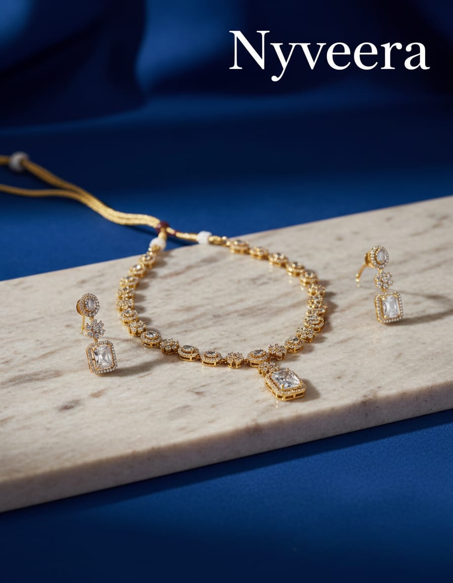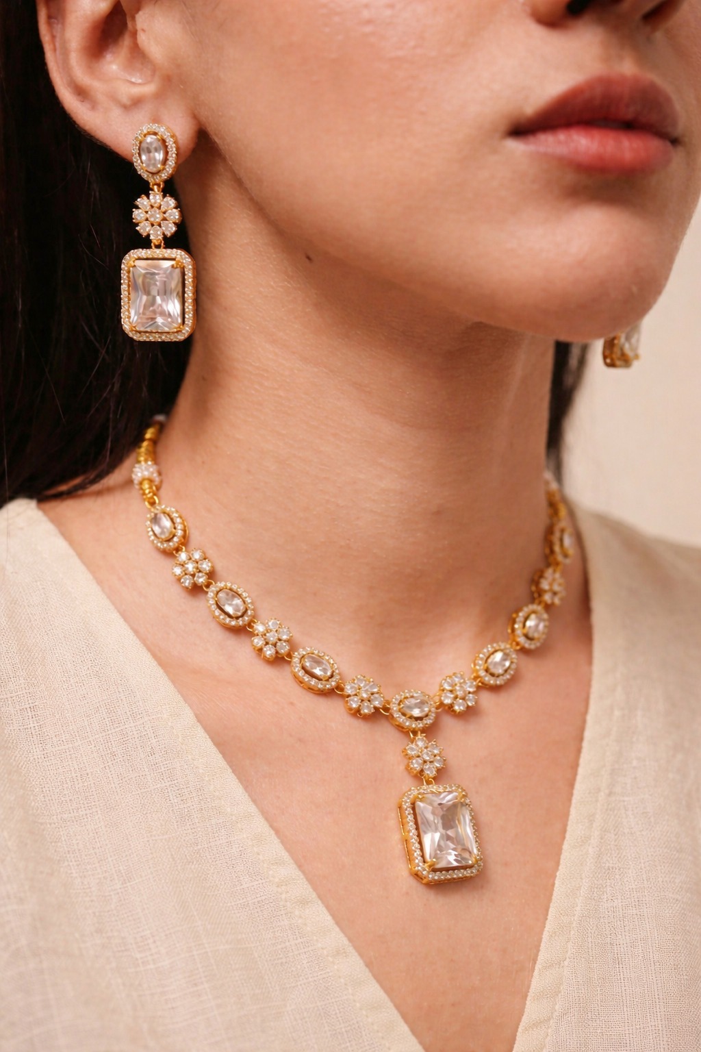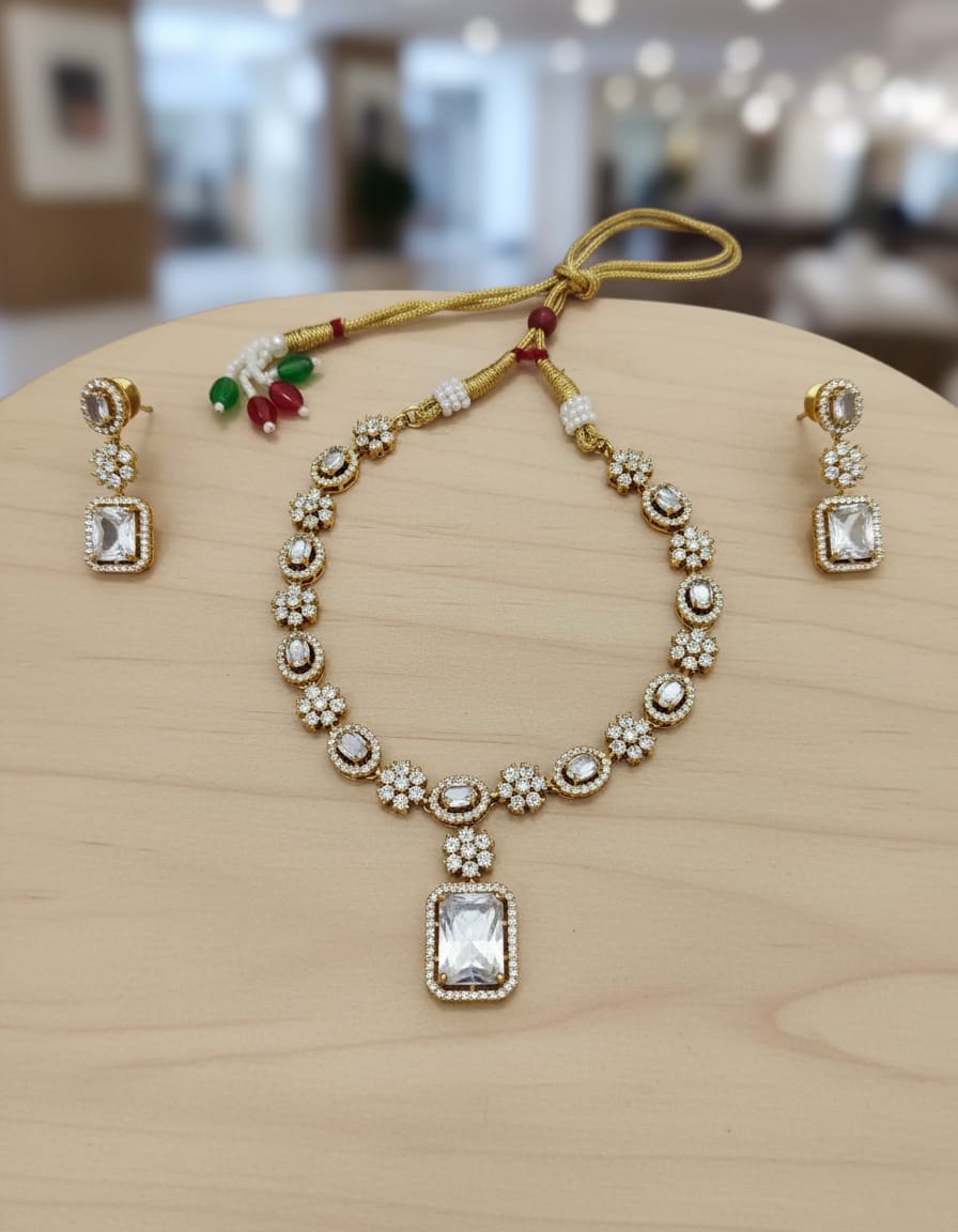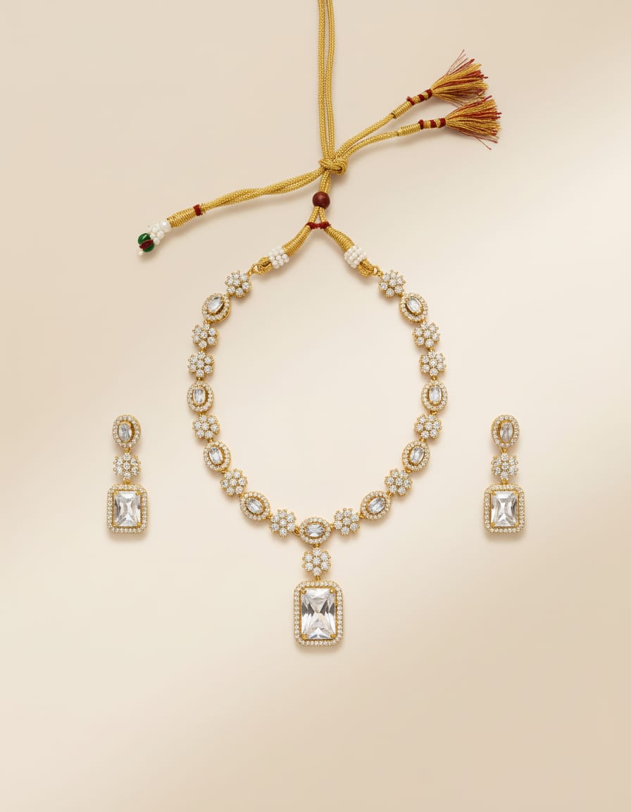 Elegant American Diamond Rectangle Pendant Necklace Set for Women – Gold Plated Adjustable Bridal Jewelry with Matching Earrings