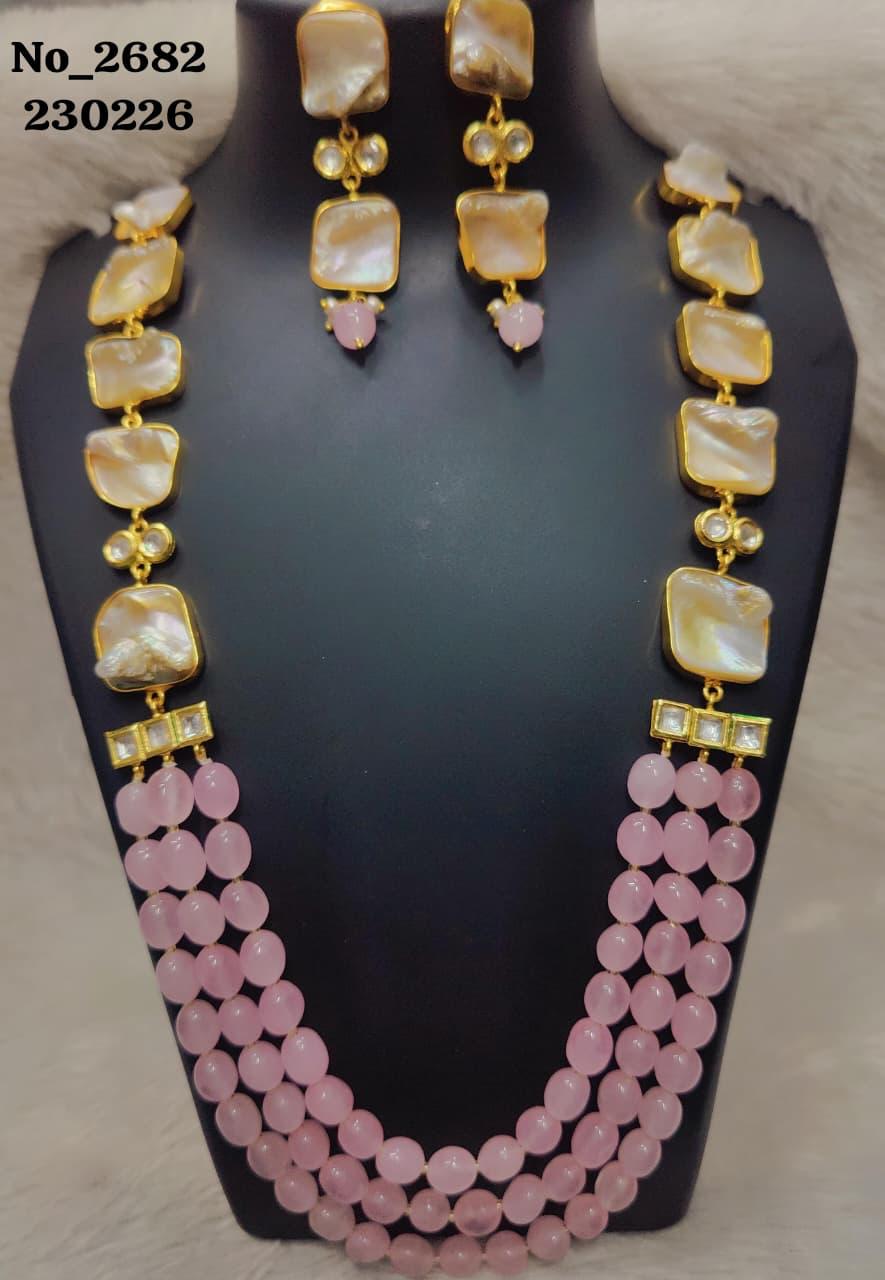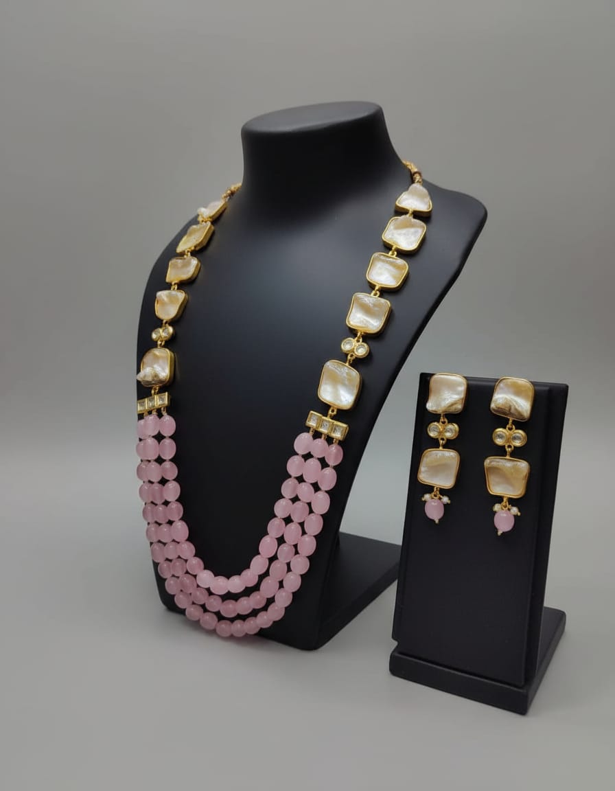 Embrace the perfect harmony of traditional craftsmanship and modern minimalism with our Handcrafted Mother of Pearl and Rose Quartz Jewellery Set. This exquisite piece is designed for the woman who appreciates timeless elegance with a contemporary twist. This layered statement necklace features a stunning double-strand design. The upper choker-style layer is adorned with luminous, square-cut Mother of Pearl stones, each encased in a delicate gold-toned frame with subtle Kundan-style accents. The necklace transitions seamlessly into three luxurious strands of polished Rose Quartz beads, known for their soft blush hue and “stone of love” symbolism. The set is perfectly balanced by a pair of matching tiered drop earrings that mirror the necklace’s geometric elegance.