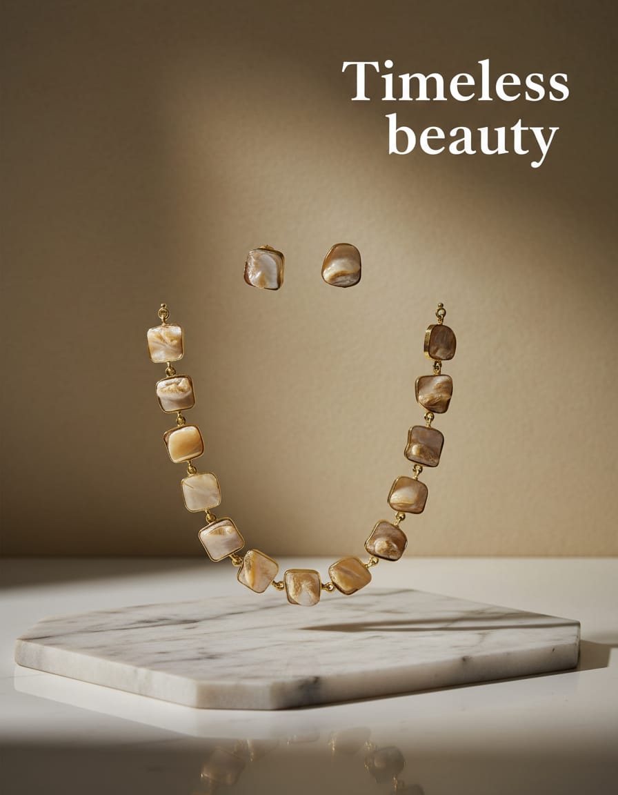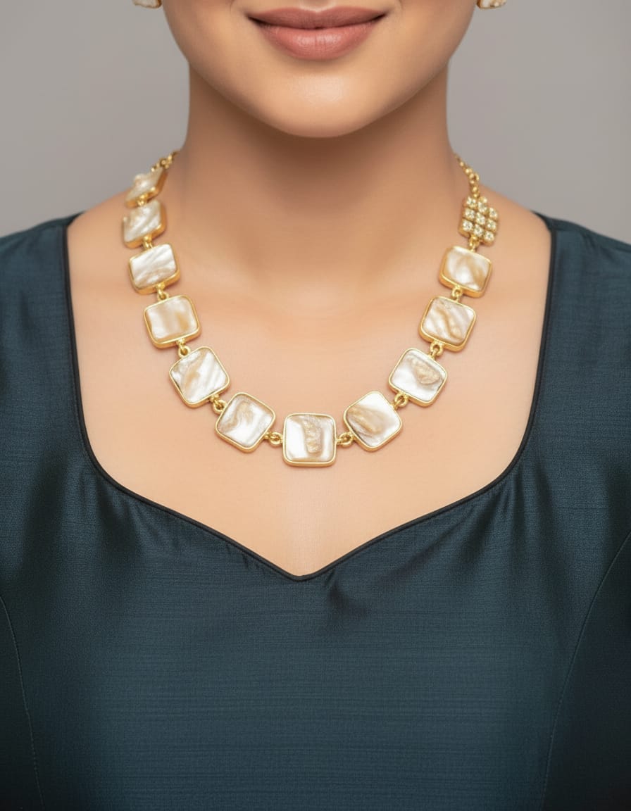 Elevate your style with this Elegant Gold Plated Square Pearl Necklace Set with Matching Earrings, designed to add a touch of sophistication to every outfit. Crafted with quality materials, this stunning jewellery set features beautifully aligned square-shaped mother of pearl stones set in a luxurious gold finish, creating a modern yet timeless look. Perfect for both everyday elegance and special occasions, this designer pearl necklace set for women complements ethnic wear, western outfits, and party ensembles effortlessly. The lightweight construction ensures comfortable wear throughout the day, while the secure clasp provides a perfect fit. Whether you’re attending a wedding, party, or festive celebration, this gold plated pearl jewellery set will make you stand out with grace and charm. It also makes a thoughtful gift for birthdays, anniversaries, and special moments.