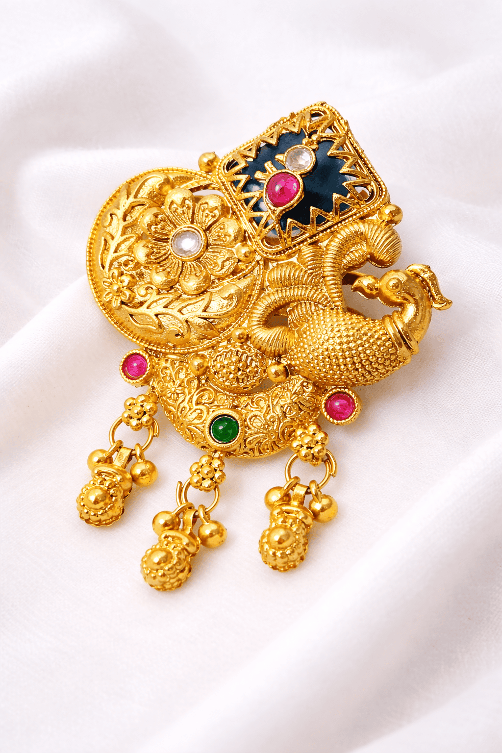Rajwada Peacock Charm Statement Ring is a bold blend of royal heritage and intricate craftsmanship. Featuring a detailed peacock motif, antique gold finish, vibrant stone accents, and elegant jhumka danglers, this ring is designed to stand out. Perfect for weddings, festive looks, and statement styling.